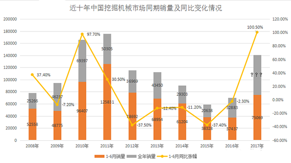 2017年已經(jīng)過(guò)去一半,從事工程機(jī)械行業(yè)的我們今年聽(tīng)到的最多的一個(gè)詞恐怕就是“回暖”,確實(shí),今年的市場(chǎng)行情的確很好,但我們都想知道:今年的工程機(jī)械行業(yè)到底如何?市場(chǎng)很好是有多好?那就讓我們透過(guò)數(shù)字來(lái)看看今年的市場(chǎng)究竟有多好。