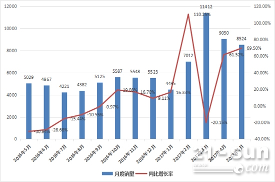 2017年5月,國內(nèi)25家主要裝載機(jī)生產(chǎn)企業(yè)合計(jì)銷售各類裝載機(jī)8524臺,同比去年5月份5029臺,大幅增長69.50%。最近8個月來,裝載機(jī)有7個月實(shí)現(xiàn)同比正增長(僅3月份下滑20%);今年1-5月份,裝載機(jī)累計(jì)銷量為40493臺,同比增長約26.06%,市場持續(xù)升溫。
