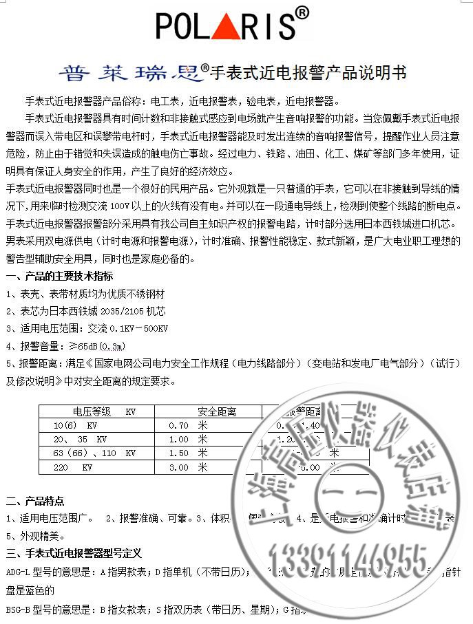 4.本品設(shè)計(jì)精巧,美觀實(shí)用,既可計(jì)時(shí),也可為驗(yàn)電防護(hù)之用;當(dāng)您戴上此表定讓你更加儒雅,更加安全。POLARIS 普萊瑞思